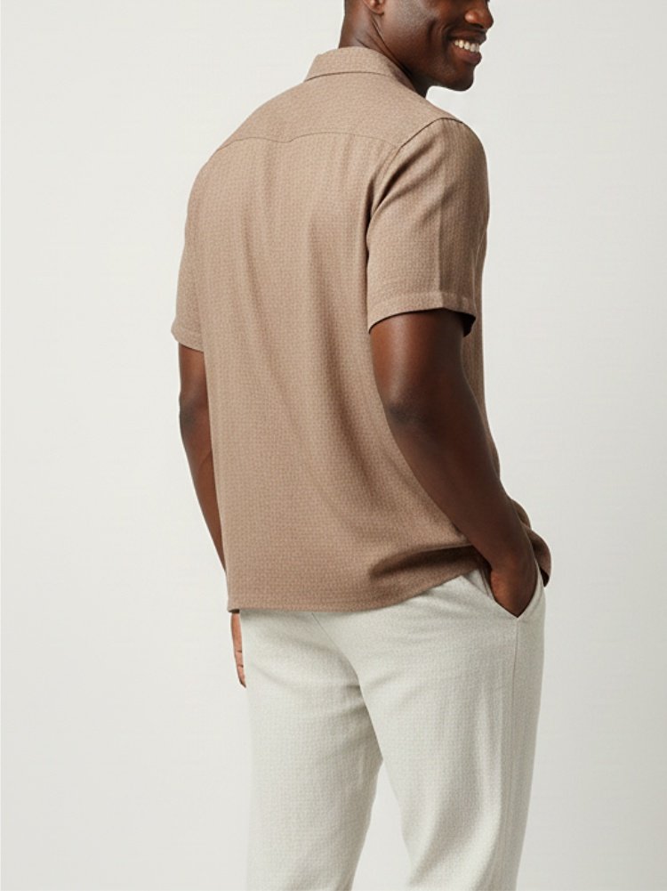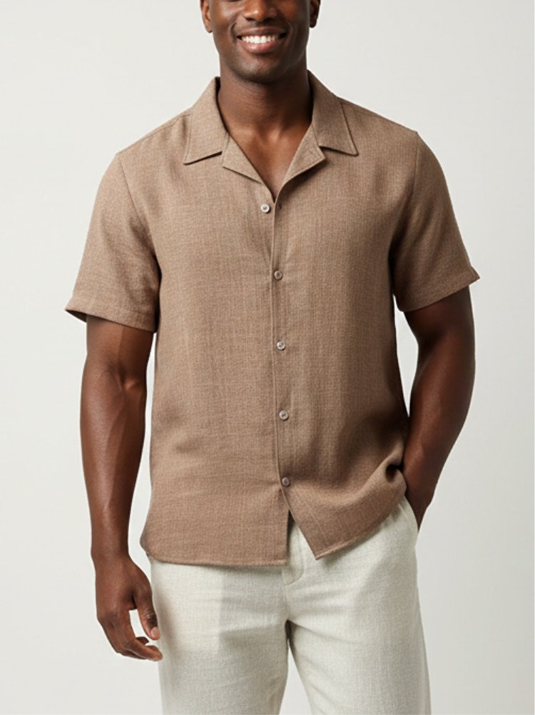 Cor: marrom | Material: linho | Tipo: fibras naturais | Modelagem: camisa aberta de botão, manga curta | Modelo veste G.