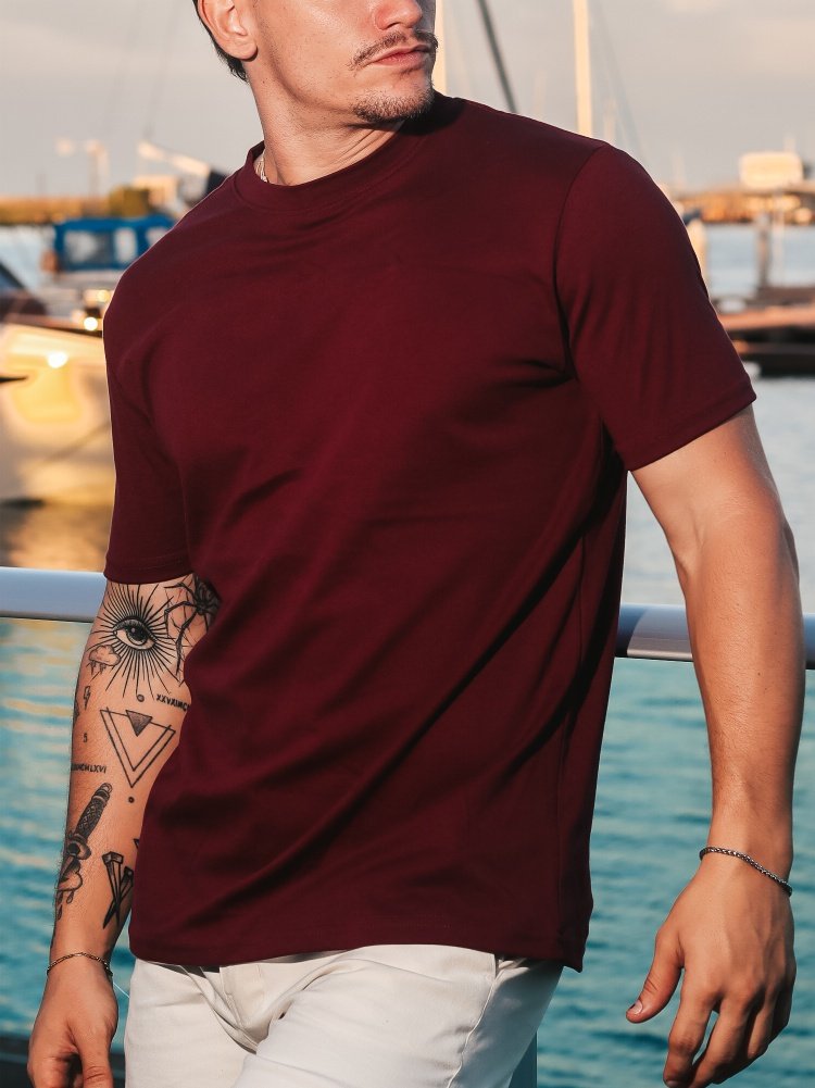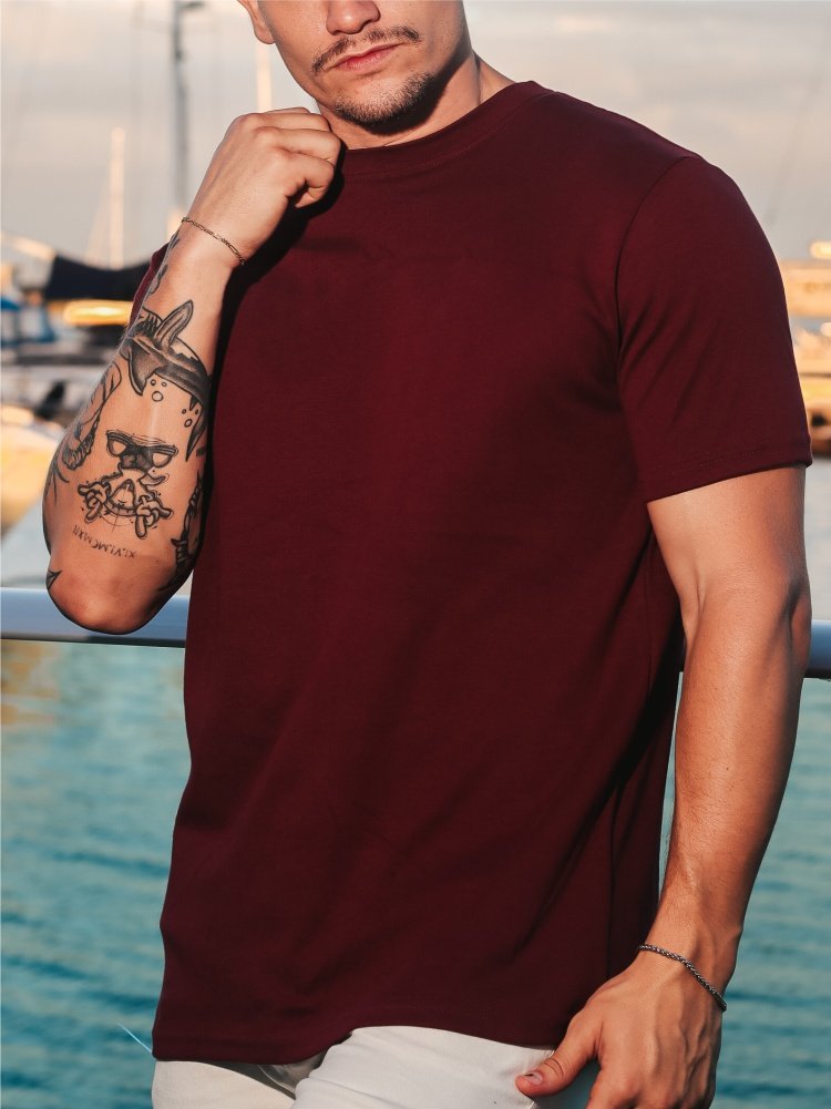 Cor: bordô | Material: algodão suedine | Tipo: malha suave e leve | Modelagem: decote careca, gola média, manga curta | Modelo veste G.
