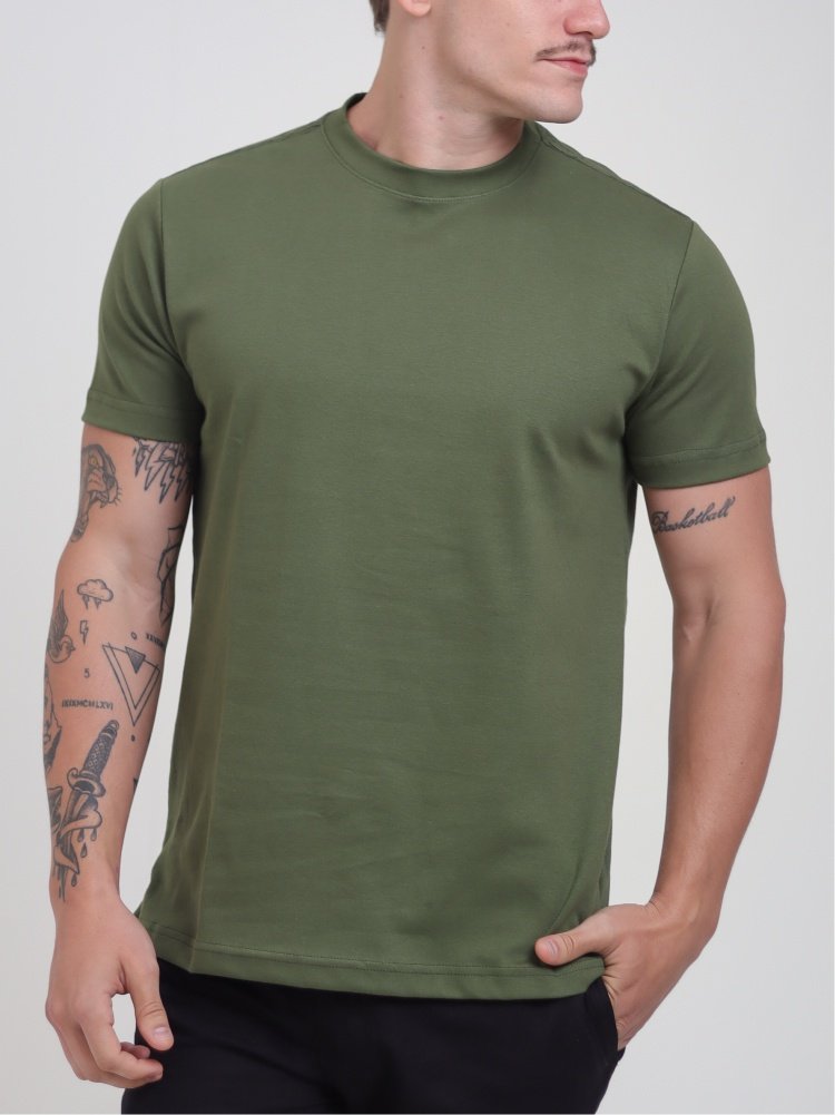 Cor: verde militar | Material: algodão suedine | Tipo: malha suave e leve | Modelagem: decote careca, gola média, manga curta | Modelo veste G.