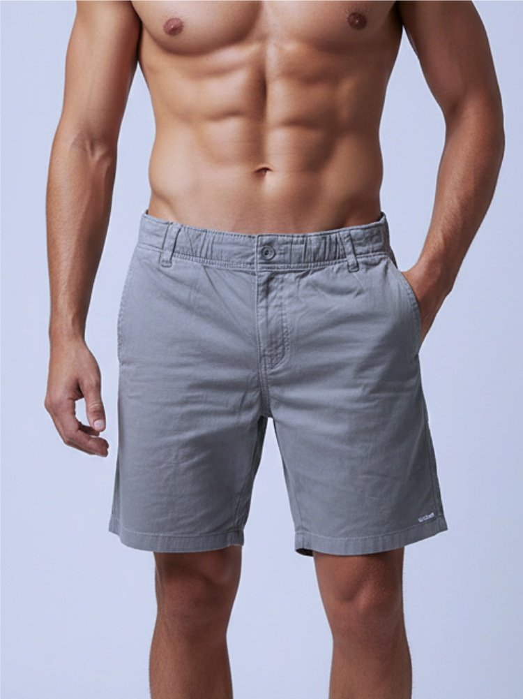 Cor: cinza claro | Material: sarja | Modelagem: short de sarja com elastano, cós em elástico, bolso lateral e traseiro | Modelo veste G.
